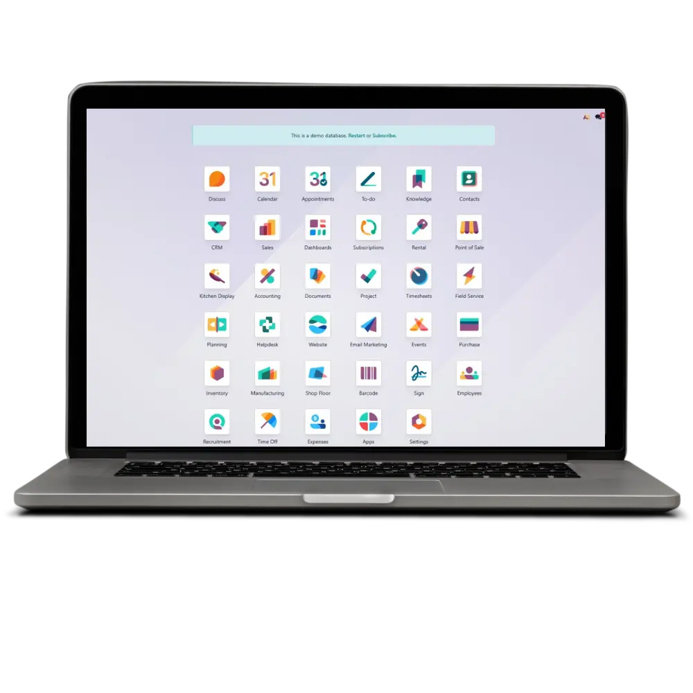 Odoo rassemble dans une seule interface l’ensemble des fonctions clés de votre activité : ventes, achats, fabrication, RH, comptabilité, marketing, et bien plus encore.